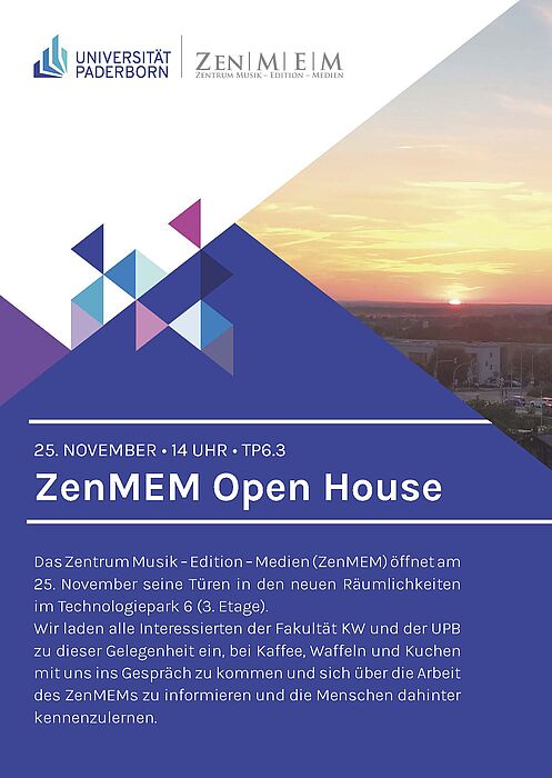 Wir laden alle Interessierten der Fakultät KW und der UPB zu dieser Gelegenheit ein, bei Kaffee, Waffeln und Kuchen mit uns ins Gespräch zu kommen und sich über die Arbeit des ZenMEMs zu informieren und die Menschen dahinter kennenzulernen.